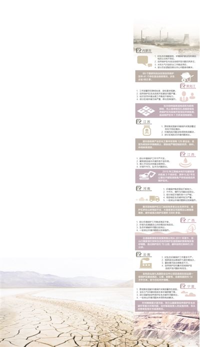 長江江蘇段分布有30個集中式飲用水水源地,現場抽查12個,8個存在環境違法問題;江西省水利廳亂作為,2015年在鄱陽湖批準3個采砂區,其中有6.82平方公里位于鄱陽湖銀魚產卵場省級自然保護區內;河南2015年全省PM10、PM2.5濃度在全國31個。▍^、市)排名分別位列第三和第一,2016年上半年,均位列全國第二;2012年至2014年,江西省樂平市政府違反《排污費征收使用管理條例》,居然多次用財政資金為36家企業代繳排污費1147萬元。
