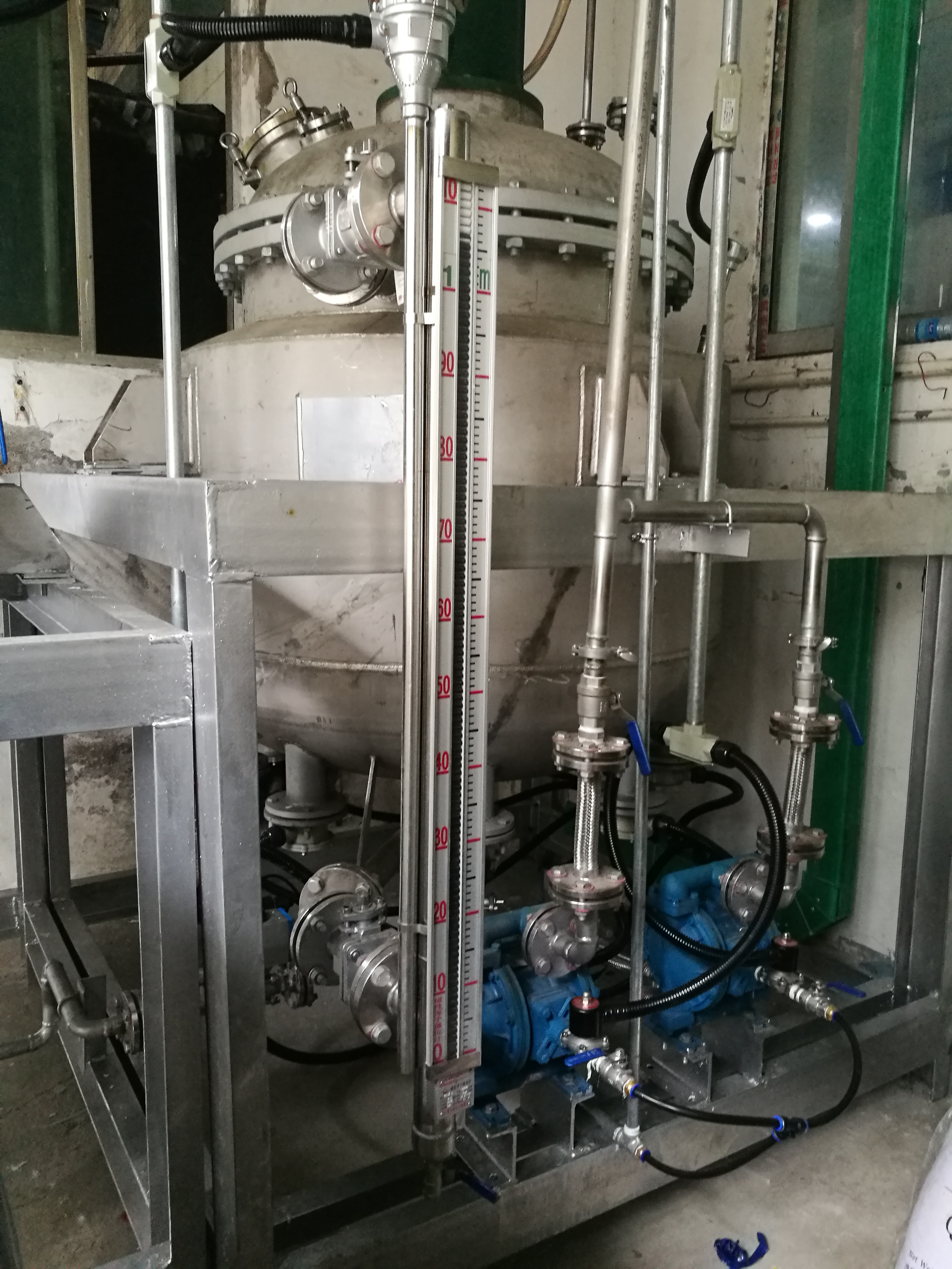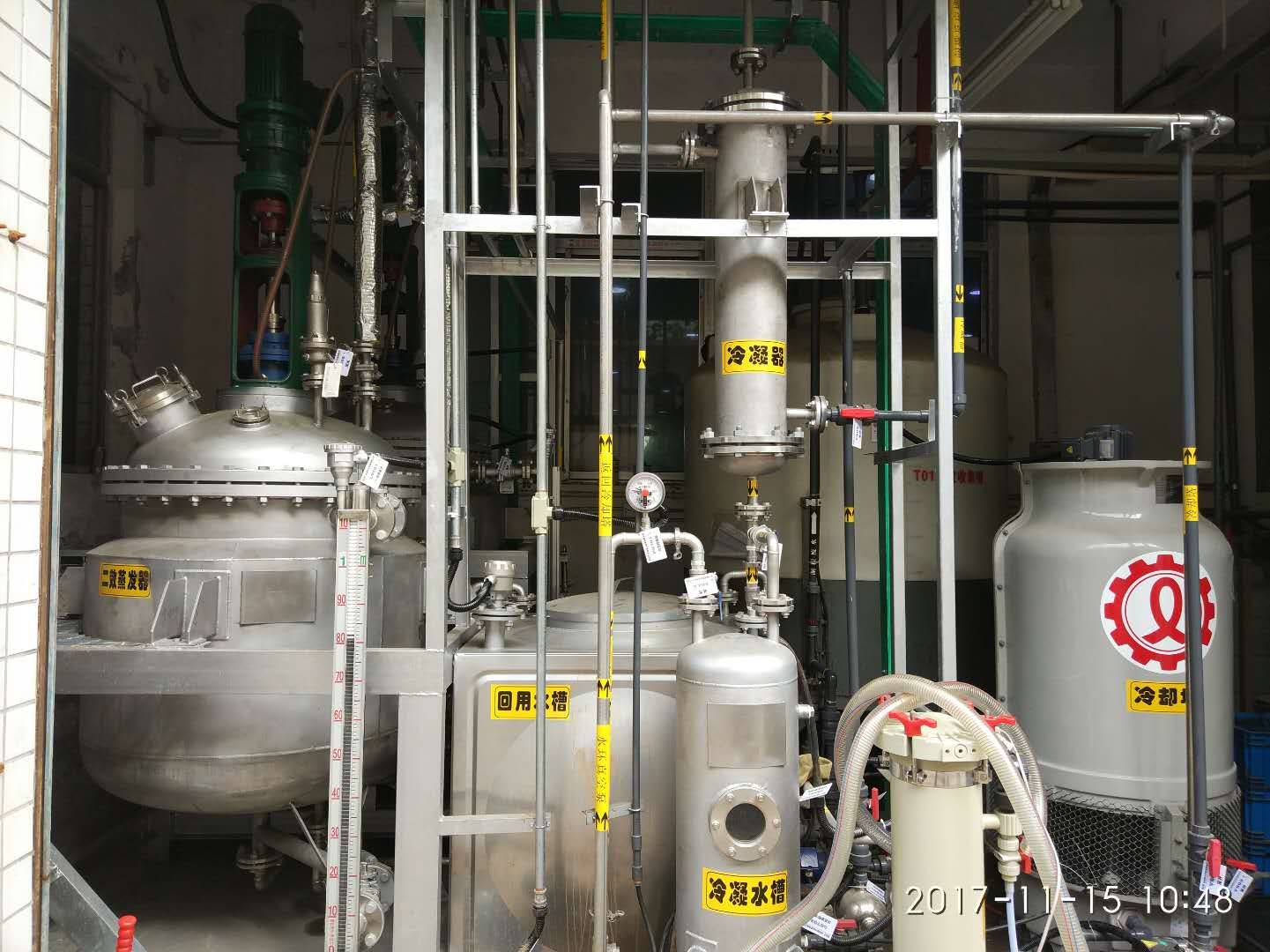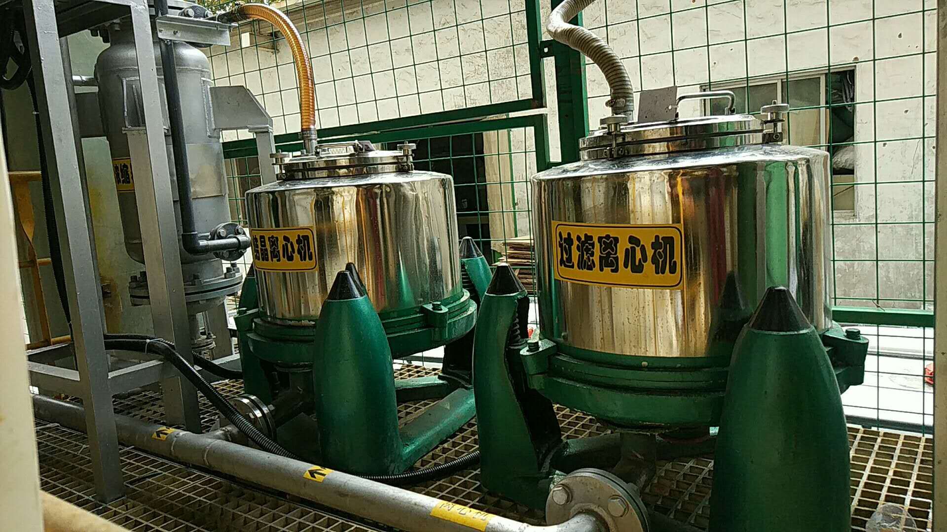 在反應釜內的濃液被濃縮到飽和時,會有晶體析出,含晶體的混合液由泵打入離心機2中進行固液分離,卸出的固體物質委外處理,另外的飽和液回流至濃液槽中再次進入蒸發器中。而蒸發出的蒸汽通過冷凝器進行冷卻后,形成冷凝水,進入回用水箱中,進入車間回用。
